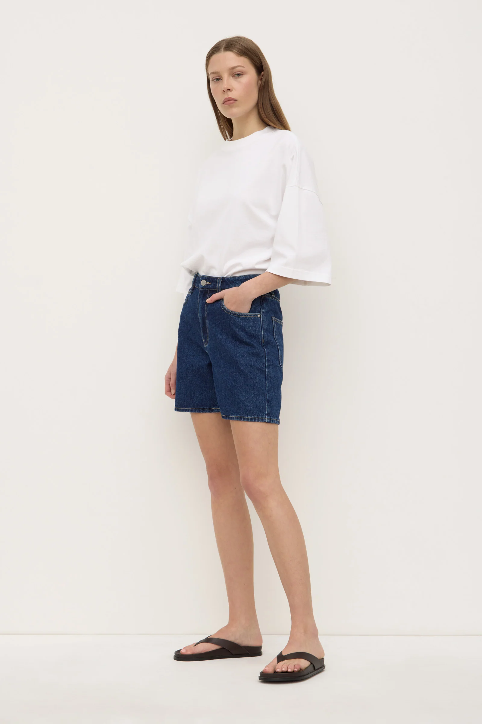 The Mid Rise Vintage Denim Short in heritage blue is a mid-rise denim short with a relaxed A-line fit through the leg.