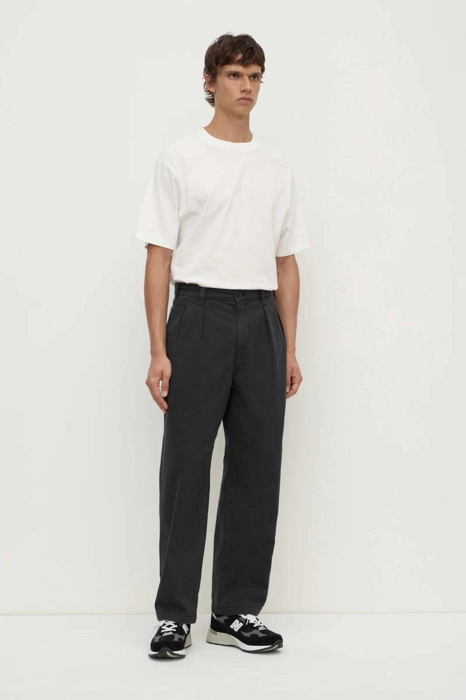 The Miles Pleated Chino in washed black is a fixed-waist cotton trouser with a relaxed leg, front pleat, and functional side and back welt pockets.