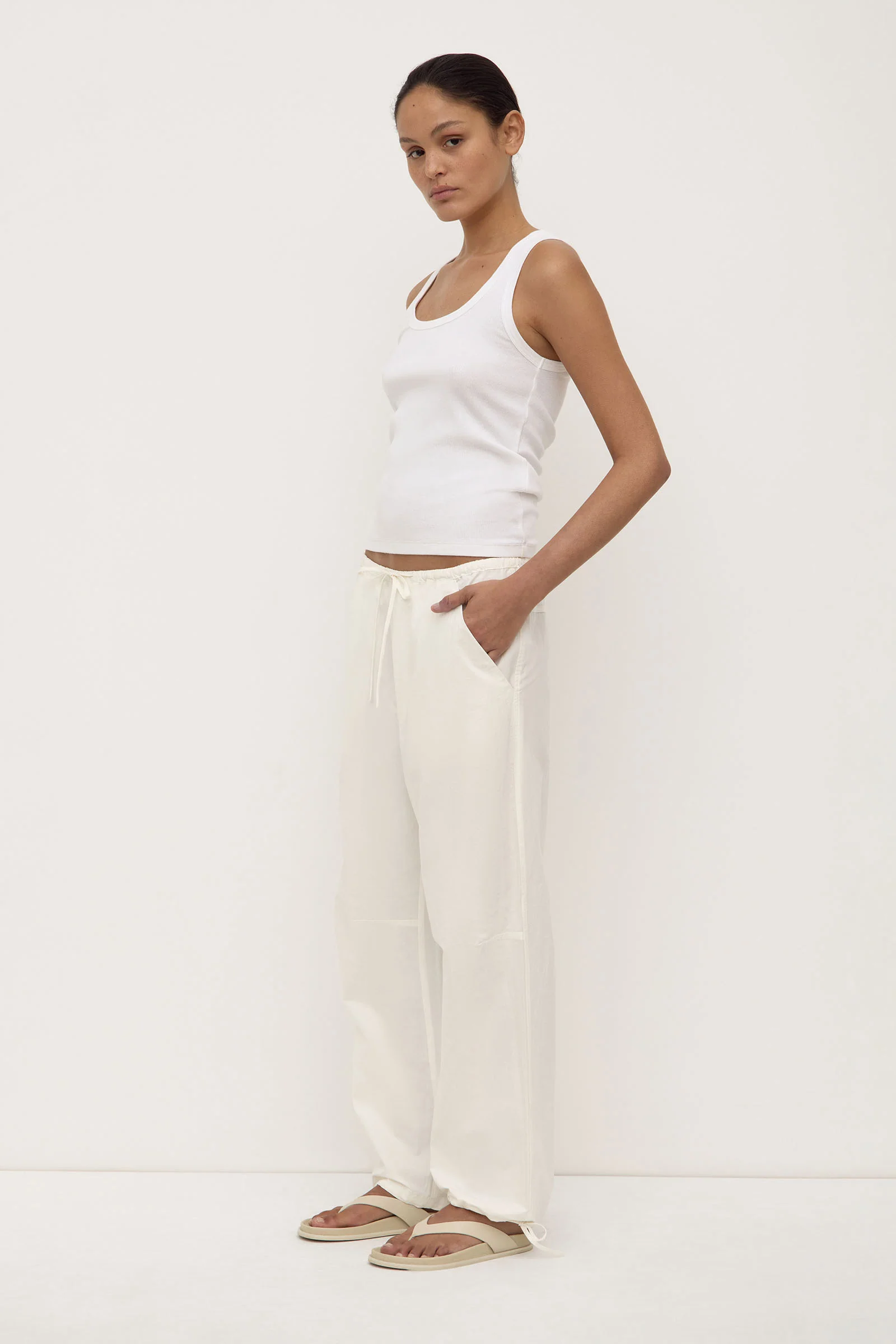Softly structured pant made from a textured cotton. Designed for a relaxed look, it features an elasticated drawcord waistband, drawcord cuffs and slant side pockets.